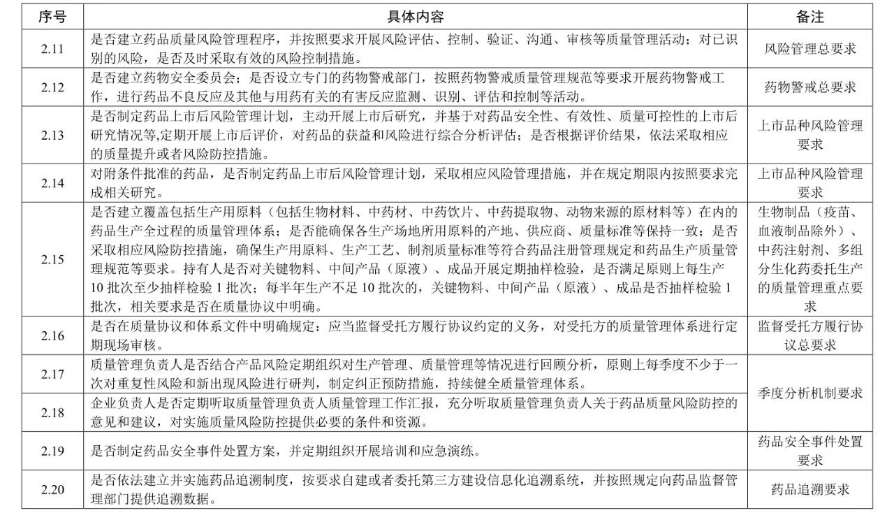 (九)各省级药品监督管理部门应当加强政策宣贯,督促本行政区域内的委托生产持有人对照《持有人监管规定》和本通知要求开展全面自查。自查重点包括:覆盖药品研制、生产、经营、使用全过程的质量管理体系的建立情况,组织机构建立健全情况,按规定配备关键岗位人员情况;对受托生产企业的质量管理体系定期审核情况;培训管理制度、年度报告制度、药物警戒制度、药品追溯制度等建立实施情况;结合产品风险,定期组织回顾分析情况,定期组织自检或内审情况。