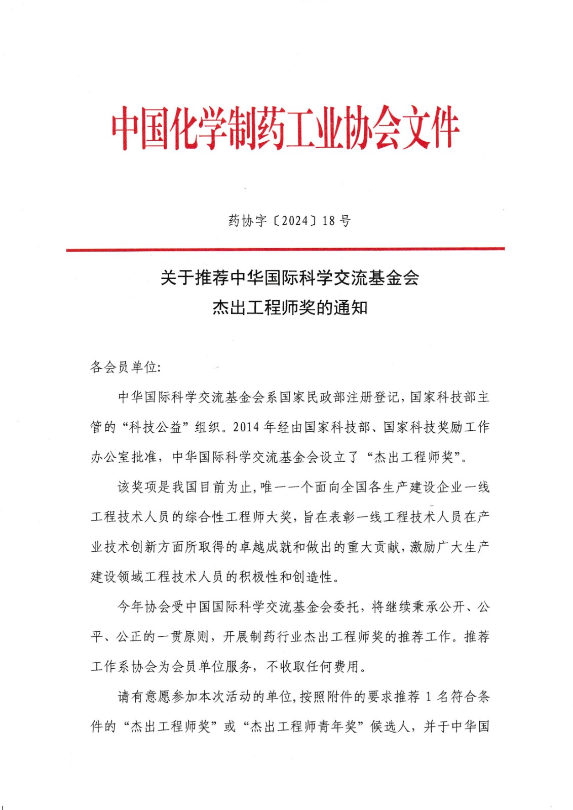 关于推荐中华国际科学交流基金会杰出工程师奖的通知
