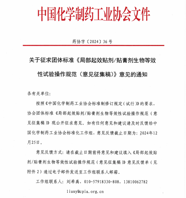 关于征求团体标准《局部起效透皮贴剂贴膏剂生物等效性试验操作规范(意见征集稿)》意见的通知