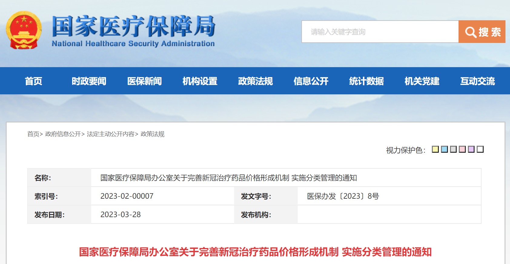 国家医疗保障局办公室关于完善新冠治疗药品价格形成机制 实施分类管理的通知